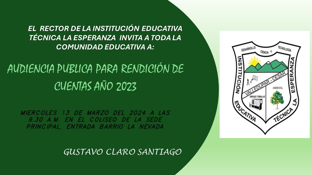 En cumplimiento de la política de rendición de cuentas La Institución Educativa Técnica La Esperanza, tiene el gusto de invitar a la comunidad educativa a la Audiencia Pública de Rendición de Cuentas vigencia 2023, la cual se realizará el día miércoles 13 de marzo de 2024 en las instalaciones del coliseo de la sede principal de la institución de 9:30 a.m. a 12:00 m.